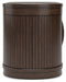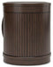 This home office desk is perfectly modern in every way. Finished on both sides in a rich wood tone, it can be floated in a room or used as a divider. Two half round door cabinets, each with an adjustable shelf, deliver a well-organized space for work-from-home professionals. It's a striking study in upscale contemporary form and function.