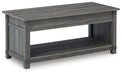 Open the door to modern farmhouse style with this lift-top coffee table. The beautiful woodgrain look and classic crossbuck metal accents are a cool touch, while the lower shelf provides surface space for fashionable home accessories. Sporting a gray replicated wood grain effect, its handy spring-loaded mechanism brings the tabletop closer to you. This versatile table makes it easier than ever to eat, work or play from the comfort of your sofa.
